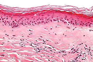 | Micrograph of subepithelial sclerosus (middle third of image) in a case of lichen sclerosus. H&E stain. | |