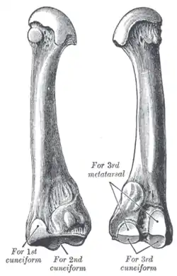 It presents four articular surfaces: one behind, of a triangular form, for articulation with the intermediate cuneiform bone; one at the upper part of its medial surface, for articulation with the medial cuneiform; and two on its lateral surface, an upper and lower, separated by a rough non-articular interval. Each of these lateral articular surfaces is divided into two by a vertical ridge: the two anterior facets articulate with the third metatarsal and the two posterior (sometimes continuous) with the lateral cuneiform. A fifth facet is occasionally present for articulation with the first metatarsal; it is oval in shape, and is situated on the medial side of the body near the base.