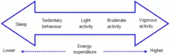 Sedentary behavior is not the same as physical inactivity: sedentary behavior is defined as "any waking behavior characterized by an energy expenditure less than or equal to 1.5 metabolic equivalents (METs), while in a sitting, reclining or lying posture". Spending most waking hours sitting does not necessarily mean that an individual is sedentary,[8] though sitting and lying down most frequently are sedentary behaviors.[9]