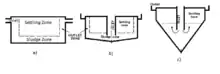 Settling basins and clarifiers can be designed as long rectangles (Figure 1.a), that are hydraulically more stable and easier to control for large volumes. Circular clarifiers (Fig. 1.b) work as a common thickener (without the usage of rakes), or as upflow tanks (Fig. 1.c).