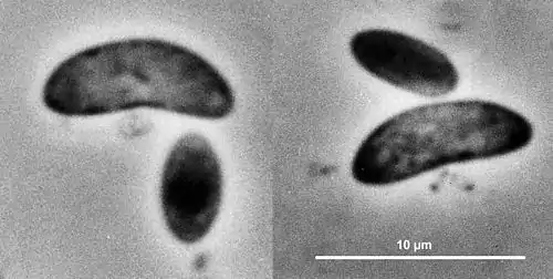 The most morphologically interesting members of the selenomonads are undoubtedly the large motile crescents found in the warm anaerobic nutrient-rich microecosystem provided by ruminant rumen, guinea-pig caecum (S. palpitans) and even pockets in the human gingiva (S. sputigena). In the illustrated atlas of sheep rumen organisms of Moir and Masson their organisms nos. 4 and 5 represent two forms of the large Selenomonads.[12] These crescents live only a short time under the light microscope but during that time display a remarkable "tumbling" motion produced by one (or two—during cell division) flagella emanating from a refractile basal body on the concave side, which was first described by Woodcock & LaPage, studied later by Lessel & Breed (with photomicrographic addendum from C. F. Robinow),[13] then by Jeynes, who (mistakenly) interpreted it as a "blepharoplast".[14][15]