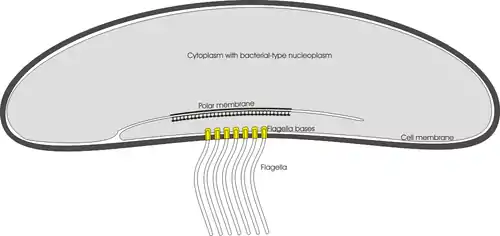 Years later, preparations of native rumen contents were examined for the first time by transmission electron microscopy of thin sections, negative stains and freeze-fracture replicas.[16][17] and many of the reasons for previous confusion were clarified. The "flagellum" was found to be quite unrelated to the flagellum of ciliate protozoa, instead consisting of a "fascicle" of numerous bacterial-type flagella (each displaying 11-fold subunit symmetry), twisted just outside the cell body into helical bundles to form strong organs of propulsion. The large crescents (which are better described as "bean-shaped") have flagella which are quite differently inserted into the concave side of the cell from those of the smaller species of Selenomonas. The small selenomonads have a rather low number of individual flagella inserted in a longitudinal row along the concave side whereas the large selenomonads have a much larger number, inserted into a circular patch of the cell membrane in the concave side in a close-packed (hexagonal) pattern, each flagellum inserted into a bullet-shaped structure at the cell membrane. Another interesting feature is the refractile body located beneath the massive flagella bundle characterizing the large crescents. It is not related morphologically to the ciliate blepharoplast (a "9+2" centriole-related structure found in cryptogams such as cycads, Ginkgo biloba and algae e.g. Euglena and Chlamydomonas). This flagella-associated structure observed in the large selenomonad can perhaps best be described as a "basal sac" formed by an invagination (in-folding) of the "polar organelle" region of the bacterial cell membrane in the middle of the concave side of the organism so that it lies directly behind the flagella. It appears to be unique in prokaryotes so far examined since in other bacteria possessing polar organelles, the structure is situated beside and around the flagella insertion bases in the cell membrane, but never lying behind them in the cytoplasm as in the case of the large selenomonad. The large crescents, with their unique morphology, still present many puzzles in their systematics. It is already clear from ultrastructural features that the genus Selenomonas is most probably an artificial classification, bringing together possibly unrelated organisms, simply because of their common possession of crescent morphology and peculiar flagellar insertion location. Successful attempts to maintain the large crescents in continuous culture over short terms have been reported by Prins [18] but long term culturing has not been possible so far. Genetic sequencing of the large crescents should provide the essential information required to better understand and classify these organisms.
