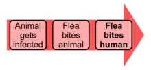 Septicemic plague is caused by horizontal and direct transmission.[3] Horizontal transmission is the transmitting of a disease from one individual to another regardless of blood relation. Direct transmission occurs from close physical contact with individuals, through common air usage, from direct bite from a flea or an infected rodent. Most common rodents may carry the bacteria and so may Leporidae such as rabbits: