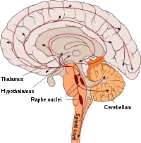 A serotonin pathway identifies aggregate projections from neurons which synthesize and communicate the monoamine neurotransmitter serotonin. These pathways are relevant to different psychiatric and neurological disorders.[1][2][3]
