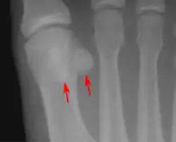 ![]() Sesamoid bones at the distal end of the first metatarsal bone of the foot. | |