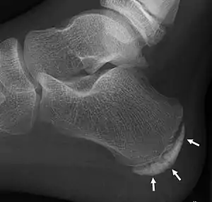 | X-ray of the foot of an 11-year-old child,showing sclerosis and fragmentation of the calcaneal apophysis. This is a sign of low sensitivity and specificity of Sever's disease, because those with Sever's disease may not have it, and it is commonly present in feet without any symptoms.[1] | |