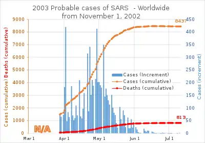 SARS was a relatively rare disease; at the end of the epidemic in June 2003, the incidence was 8,422 cases with a case fatality rate (CFR) of 11%.[4] No cases of SARS-CoV-1 have been reported worldwide since 2004.[5] As of 2020, SARS-CoV-1 is considered eradicated in humans, but as the virus also infects animals, it is possible that it will re-emerge in the future.[6]