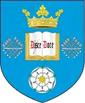 The coat of arms of the Sheffield Faculty of Medicine was granted by the College of Arms on 12 December 2003.[1] It features elements from the coat of arms of the University of Sheffield: the Crown of Success, two sheaves of arrows and the open books, as well as the azure background colour. The rod of Asclepius is centred on the shield.[54] It can be seen throughout the Medical School on its buildings. A variation of the crest is used by various Sheffield Medical Society sports teams.[55]