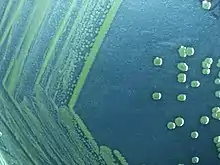 | Gram negative Shigella sonnei bacteria which spent 48 hours cultured on Hektoen enteric agar (HEK). | |