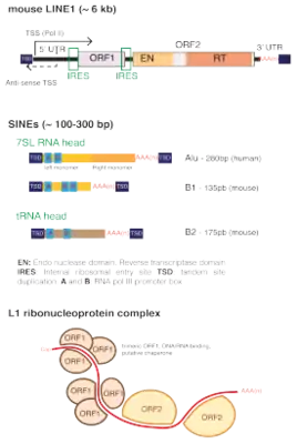 - Doucet AJ, Hulme AE, Sahinovic E, Kulpa DA, Moldovan JB, Kopera HC, Athanikar JN, Hasnaoui M, Bucheton A, Moran JV, Gilbert N (October 2010). "Characterization of LINE-1 ribonucleoprotein particles". PLOS Genetics. 6 (10): e1001150. doi:10.1371/journal.pgen.1001150. PMC 2951350. PMID 20949108.