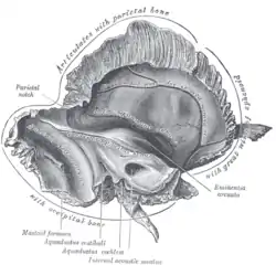 The inner surface of the mastoid portion of the temporal bone presents a deep, curved groove, the sigmoid sulcus, which lodges part of the transverse sinus; in it may be seen the opening of the mastoid foramen.