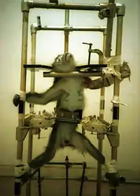 ![]() Domitian, one of the Silver Spring monkeys, in one of the images distributed by PETA to newspapers.[1] | |
