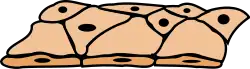 A simple squamous epithelium is a single layer of flat cells in contact with the basal lamina (one of the two layers of the basement membrane) of the epithelium.[1] This type of epithelium is often permeable and occurs where small molecules need to pass quickly through membranes via filtration or diffusion. Simple squamous epithelia are found in capillaries, alveoli, glomeruli, and other tissues where rapid diffusion is required.[2] Within the cardiovascular system such as lining capillaries or the inside of the heart, simple squamous epithelium is specifically called the endothelium.[3] Cells are flat with flattened and oblong nuclei. It is also called pavement epithelium due to its tile-like appearance. This epithelium is associated with filtration and diffusion. This tissue is extremely thin, and forms a delicate lining. It offers very little protection.