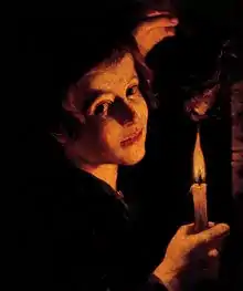 A singe is a treatment available at a barber's.[1] A lit taper (candle) or other device is used to lightly burn and shrivel the hair. The practice of singeing was popular approximately a century ago; it was believed that hair had "fluid" in it and singeing would trap the fluid in. Singeing is supposed to have beneficial effects – sealing cut ends, closing up the follicles, preventing the hair from bleeding (a belief that has since been debunked)[2] and encouraging it to grow.[3] Singeing is still sometimes used to bond natural hair to hair extensions.[4]