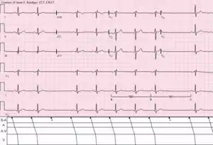 A sinoatrial block (also spelled sinuatrial block)[1] is a disorder in the normal rhythm of the heart, known as a heart block, that is initiated in the sinoatrial node. The initial action impulse in a heart is usually formed in the sinoatrial node (SA node) and carried through the atria, down the internodal atrial pathways to the atrioventricular node (AV) node.[2] In normal conduction, the impulse would travel across the bundle of His (AV bundle), down the bundle branches, and into the Purkinje fibers. This would depolarize the ventricles and cause them to contract.