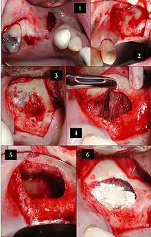 The graft material used can be either an autograft, an allograft, a xenograft, an alloplast (a growth-factor infused collagen matrix), synthetic variants, or combinations thereof.[7] Studies indicate that the mere lifting of the sinus membrane, creation of a void space and blood clot formation might result in new bone owing to the principles of guided bone regeneration.[8] The long-term prognosis for the technique is estimated to 94%.[9]