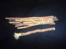 The miswak (miswaak, siwak, sewak, Arabic: سواك or مسواك) is a teeth cleaning twig made from the Salvadora persica tree (known as arāk, أراك, in Arabic). It is reputed to have been used over 7000 years ago.[1] The miswak's properties have been described thus: "Apart from their antibacterial activity which may help control the formation and activity of dental plaque, they can be used effectively as a natural toothbrush for teeth cleaning. Such sticks are effective, inexpensive, common, available, and contain many medical properties".[2] It also features prominently in Islamic hygienical jurisprudence.