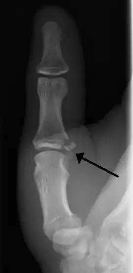 • Avulsion of distal UCL causing the pulling off of a bone chip off the proximal phalanx base.[4]
