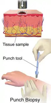 A punch biopsy is done with a circular blade ranging in size from 1 mm to 8 mm. The blade, which is attached to a pencil-like handle, is rotated down through the epidermis and dermis, and into the subcutaneous fat, producing a cylindrical core of tissue.[1] An incision made with a punch biopsy is easily closed with one or two sutures. Some punch biopsies are shaped like an ellipse, although one can accomplish the same desired shape with a standard scalpel. The 1 mm and 1.5 mm punch are ideal for locations where cosmetic appearance is difficult to accomplish with the shave method. Minimal bleeding is noted with the 1 mm punch, and often the wound is left to heal without stitching for the smaller punch biopsies. The disadvantage of the 1 mm punch is that the tissue obtained is almost impossible to see at times due to small size, and the 1.5 mm biopsy is preferred in most cases. The common punch size used to diagnose most inflammatory skin conditions is the 3.5 or 4 mm punch.[2]