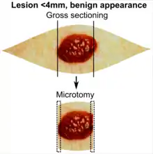 In table above, each top image shows recommended lines for cutting out slices to be submitted for further processing. Bottom image shows which side of the slice that should be put to microtomy. Dashed lines here mean that either side could be used. The entire specimen may be sliced and submitted if the risk of malignancy is high.[3] Otherwise the rest may be saved in fixation in case microscopy indicates further sampling.