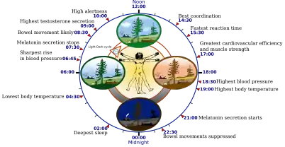 Homeostatic sleep propensity (the need for sleep as a function of the amount of time elapsed since the last adequate sleep episode) must be balanced against the circadian element for satisfactory sleep.[45][46] Along with corresponding messages from the circadian clock, this tells the body it needs to sleep.[47] The timing is correct when the following two circadian markers occur after the middle of the sleep episode and before awakening:[48] maximum concentration of the hormone melatonin, and minimum core body temperature.