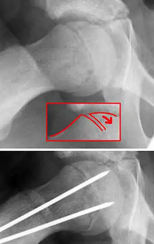 | X-ray showing a slipped capital femoral epiphysis, before and after surgical fixation. | |