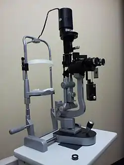 In ophthalmology and optometry, the instrument is called a "slit lamp", although it is more correctly called a "slit lamp instrument".[3] Today's instrument is a combination of two separate developments, the corneal microscope and the slit lamp itself. The first concept of a slit lamp dates back to 1911 credited to Allvar Gullstrand and his "large reflection-free ophthalmoscope."[3] The instrument was manufactured by Zeiss and consisted of a special illuminator connected to a small stand base through a vertical adjustable column. The base was able to move freely on a glass plate. The illuminator employed a Nernst glower which was later converted into a slit through a simple optical system.[4] However, the instrument never received much attention and the term "slit lamp" did not appear in any literature again until 1914.