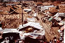 A slum is usually a highly populated urban residential area consisting mostly of closely packed, decrepit housing units in a situation of deteriorated or incomplete infrastructure, inhabited primarily by impoverished persons.[1] Although slums, especially in America, are usually located in urban areas, in other countries they can be located in suburban areas where housing quality is low and living conditions are poor.[2] While slums differ in size and other characteristics, most lack reliable sanitation services, supply of clean water, reliable electricity, law enforcement, and other basic services. Slum residences vary from shanty houses to professionally built dwellings which, because of poor-quality construction and/or lack of basic maintenance, have deteriorated.[3]