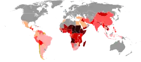Slum dwellers usually experience a high rate of disease.[187][133] Diseases that have been reported in slums include cholera,[188][189] HIV/AIDS,[190][191] measles,[192] malaria,[193] dengue,[194] typhoid,[195] drug resistant tuberculosis,[196][197] and other epidemics.[198][199] Studies focus on children's health in slums address that cholera and diarrhea are especially common among young children.[200][201] Besides children's vulnerability to diseases, many scholars also focus on high HIV/AIDS prevalence in slums among women.[202][203] Throughout slum areas in various parts of the world, infectious diseases are a significant contributor to high mortality rates.[204] For example, according to a study in Nairobi's slums, HIV/AIDS and tuberculosis attributed to about 50% of the mortality burden.[205]