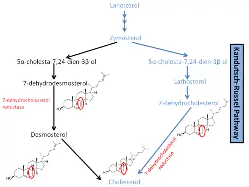 Through a complicated series of reactions, lanosterol leads to the formation of zymosterol. As shown in a diagram to the right, it is at this point that the pathway diverges. In humans, the main pathway leading to cholesterol is known as the Kandutsch–Russell pathway.[3] Zymosterol is metabolized to 5α-cholesta-7,24-dien-3β-ol, then to lathosterol, and then to 7-dehydrocholesterol, or 7-DHC. 7-DHC is the immediate precursor to cholesterol, and the enzyme DHCR7 is responsible for converting 7-DHC to cholesterol.[1] DHCR7 reduces the double bond on carbon 7 of 7-DHC, leading to the unesterified product.[9] Mutations in this enzyme are responsible for the wide range of defects present in SLOS. In another pathway leading to cholesterol synthesis, DHCR7 is required for the reduction of 7-Dehydrodesmosterol to desmosterol.