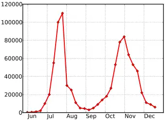 During the influenza pandemic of 1918, Philadelphia saw its first cases of influenza on 17 September.[80][17] The city continued with its planned parade and gathering of more than 200000 people on 28 September and over the subsequent three days, the city's 31 hospitals became fully occupied. During the week ending 16 October, over 4500 people died.[52][81] Social distancing measures were introduced on 3 October, on the orders of St. Louis physician Max C. Starkloff,[82] more than two weeks after the first case.[17] Unlike Philadelphia, St. Louis experienced its first cases of influenza on 5 October and the city took two days to implement several social distancing measures,[17] including closing schools, theatres, and other places where people get together. It banned public gatherings, including funerals. The actions slowed the spread of influenza in St. Louis and a spike in cases and deaths, as had happened in Philadelphia, did not occur.[83] The final death rate in St. Louis increased following a second wave of cases, but remained overall less than in other cities.[84] Bootsma and Ferguson analyzed social distancing interventions in sixteen U.S. cities during the 1918 epidemic and found that time-limited interventions reduced total mortality only moderately (perhaps 10–30%), and that the impact was often very limited because the interventions were introduced too late and lifted too early. It was observed that several cities experienced a second epidemic peak after social distancing controls were lifted, because susceptible individuals who had been protected were now exposed.[85]