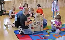 Play is often cited as a central building block to children's development, so much so that it has been stated as a human right of all children.[19] The complexity and diversity of play increases immensely in the preschool years, most notably with the onset of cooperative play, where children work toward a common goal, and socio-dramatic play (a type of cooperative play), where children act out make believe scenes.[7] Socio-dramatic play is rooted in the child's real-life experiences, falling into three categories: family scenes (e.g., "playing house" with assigned mommy and daddy roles), character scenes (e.g., being a superhero, or a princess), and functional scenes (e.g., playing doctor).[20] Cooperative play and socio-dramatic play both bring about increased social interactions, as compared to solitary play and parallel play, where children play similarly next to each other without significant interaction (e.g., two children building their own towers). It is here where play becomes intertwined with social emotional development. The characteristics of socio-dramatic play allow children to practice cooperation, negotiation, and conflict resolution skills, as well as engage in role-playing that promotes perspective taking. As such, socio-dramatic play has been associated with all of these social emotional skills in children.[20]