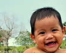 Beginning at birth, newborns have the capacity to signal generalized distress in response to unpleasant stimuli and bodily states, such as pain, hunger, body temperature, and stimulation.[7] They may smile, seemingly involuntarily, when satiated, in their sleep, or in response to pleasant touch. Infants begin using a “social smile,” or a smile in response to a positive social interaction, at approximately 2 to 3 months of age, and laughter begins at 3 to 4 months.[7] Expressions of happiness become more intentional with age, with young children interrupting their actions to smile or express happiness to nearby adults at 8–10 months of age, and with markedly different kinds of smiles (e.g., grin, muted smile, mouth open smile) developing at 10 to 12 months of age.[7]