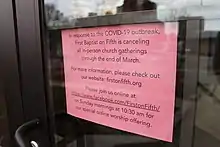 The pandemic has impacted religion in various ways, including the cancellation of the worship services of various faiths, the closure of Sunday Schools, as well as the cancellation of pilgrimages surrounding observances and festivals.[34] Many churches, synagogues, mosques, and temples have offered worship through livestream amidst the pandemic.[35] Relief wings of religious organisations have dispatched medical supplies and other aid to affected areas.[36] Adherents of many religions have gathered together to pray for an end to the pandemic, for those affected by it, as well as for the deity they believe in to give physicians and scientists the wisdom to combat the disease;[37][38][39] in the United States, Trump designated 15 March 2020 as a National Day of Prayer for "God’s healing hand to be placed on the people of our Nation".[40][41]