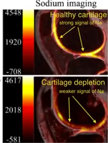 23Na MRI measures cellular metabolic rate as well as disease-related change in tissues and organs.[14] It had improved from 45min length to only 15 mins at 1.5T.[6][11] Unlike other MRI scanning, sodium MRI captures only sodium signals inside bodies. For cartilage degeneration, proteoglycan degrades with negative charge, and positively charged sodium ion bond with proteoglycan.[2] Both proteoglycan and sodium level decrease, so less signals are observed by sodium MRI. 23Na MRI is very sensitive and specific to change in proteoglycan, so it is good to use for monitoring of proteoglycan degeneration in cartilage.[2][15]