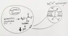 Tissue sodium concentration (TSC) is tightly regulated by healthy cells and are altered by energy status and cellular integrity, making it an effective marker for disease states.[4][6][7] Cells maintain a low intracellular Na+ concentration by actively pumping Na ions out via the Na+/K+ ATPase channel, and any challenge to the cell’s metabolism causing low ATP supply or compromise of the cell’s membrane integrity will drastically increase intracellular Na+ concentrations. After exhaustive exercise, for example, 23Na MRI can detect Na+ levels in tissues rising sharply, and can even visualize a sodium-rich meal in a patient’s stomach. Malignant tumors in particular alter their metabolism drastically, often to account for hypoxic intratumor conditions, leading to an decrease in cytosolic pH. To compensate, Na+ ions from the extracellular space are exchanged for protons in the Na+/H+ antiport,[6] the loss of which often attenuates cancer growth.[8] Therefore, 23Na MRI is a useful clinical tool for detecting a number of disease states, including heart disease[9] and cancer, as well as monitoring therapy. For example, 23Na MRI has been shown to measure cellularity in ovarian cancer.[10] Tissue damage in stroke patients can also be evaluated using 23Na MRI, with one study showing that a change of 50% higher TSC than the TSC in healthy brain tissue is consistent with complete infarction,[11] and therefore can be used to determine tissue viability and treatment options for the patient. Tumor malignancy can also be evaluated based on the increases in TSC of rapidly proliferating cells. Malignant tumors have approximately 50-60% increased TSC relative to that of healthy tissues[11] – however, increases in TSC cannot be determined to be due to changes in extracellular volume, intracellular sodium content or neovascularization. Another interesting use of 23Na MRI is in evaluating multiple sclerosis, wherein accumulation of sodium in axons can lead to axon degeneration.[12] Preliminary studies have shown that there is a positive correlation between elevated TSC and disability.
