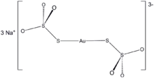 Sodium aurothiosulfate, or sanocrysin, is the inorganic compound with the formula Na3Au(S2O3)2·2H2O. This salt contains an anionic linear coordination complex of gold(I) bound to two thiosulfate ligands.[1][2] Like several other gold compounds, this species is used as an antirheumatic.[3] The first placebo-controlled trial was probably conducted in 1931, when sanocrysin was compared with distilled water for the treatment of tuberculosis.[4]