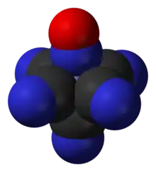 Nitroprusside is a complex anion that features an octahedral iron(III) centre surrounded by five tightly bound cyanide ligands and one linear nitric oxide ligand (Fe-N-O angle = 176.2 °). The anion possesses idealized C4vsymmetry.