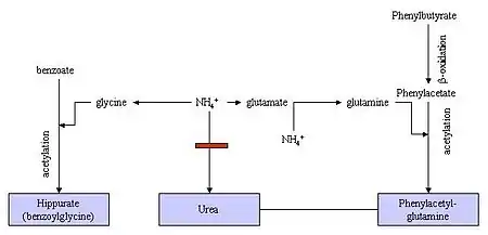 Sodium phenylbutyrate is taken orally or by nasogastric intubation as a tablet or powder, and tastes very salty and bitter. It treats urea cycle disorders, genetic diseases in which nitrogen waste builds up in the blood plasma as ammonia glutamine (a state called hyperammonemia) due to deficiences in the enzymes carbamoyl phosphate synthetase I, ornithine transcarbamylase, or argininosuccinic acid synthetase.[3][1] Uncontrolled, this causes mental retardation and early death.[1] Sodium phenylbutyrate metabolites allows the kidneys to excrete excess nitrogen in place of urea, and coupled with dialysis, amino acid supplements and a protein-restricted diet, children born with urea cycle disorders can usually survive beyond 12 months.[1] Patients may need treatment for all their life.[1] The treatment was introduced by researchers in the 1990s, and approved by the U.S. Food and Drugs Administration (FDA) in April 1996.[5][6]