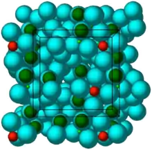 ![]() Crystal structure of ZS-9. Blue spheres = oxygen atoms, red spheres = zirconium atoms, green spheres = silicon atoms. | |
