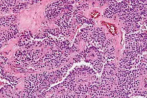 Micrograph of a solid pseudopapillary tumour. H&E stain.