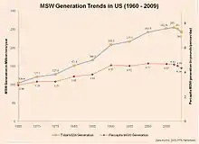 Before the 1980s most of the waste generated was either landfilled or burned. More than 90% of the municipal solid waste was landfilled or disposed with less than 7% materials recovery during the 1960s and 70s. This trend started changing after the 1980s when landfill disposal declined to about 54% and resource recovery increased to more than 33%.[6] The most recent numbers from the EPA indicate that in 2012 the US municipal solid waste recycle rate was 34.5%.[20] This section describes the common methods of solid waste disposal practiced in United States and worldwide.