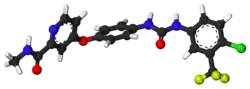 Sorafenib (co-developed and co-marketed by Bayer and Onyx Pharmaceuticals as Nexavar),[1] is a kinase inhibitor drug approved for the treatment of primary kidney cancer (advanced renal cell carcinoma), advanced primary liver cancer (hepatocellular carcinoma), FLT3-ITD positive AML and radioactive iodine resistant advanced thyroid carcinoma.