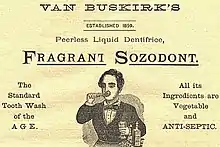 Created in 1859 by druggist Roswell van Buskirk (circa 1824–1902) of New Jersey,[1] it derived its name from the Greek sozo, meaning "to save", and dontia, meaning "teeth". Sozodont was later manufactured by the firm Hall & Ruckel of New York, New York, and London, England. Known as Van Buskirk's Fragrant Sozodont, or Van Buskirk's Fragrant and Antiseptic Sozodont, the product was dispensed from a glass bottle through a metal sprinkler and, as illustrated advertisements show, could be applied to the teeth using a toothbrush. The product made strong use of advertising as a marketing tool and by the late nineteenth century was an established household word.