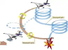 The graveyard spiral and graveyard spin are both caused by the acclimation of the semicircular canals to prolonged rotation; after a banked turn (in the case of the graveyard spiral) or spin (for the graveyard spin) of approximately 20 seconds, the fluid in the semicircular canals has been entrained into motion by friction, and the vestibular system no longer perceives a rotational acceleration. If the aviator then ends the turn or spin and returns to level flight, the continued motion of the fluid will cause a sensation the aircraft is turning or spinning in the opposite direction, and the pilot may re-enter the original turn or spin inadvertently; the aviator may not recognize the illusion before the aircraft loses too much altitude, resulting in a collision with terrain[8] or the g-forces on the aircraft may exceed the structural strength of the airframe, resulting in catastrophic failure. One of the most famous mishaps in aviation history involving the graveyard spiral is the crash involving John F. Kennedy Jr. in 1999.[14]