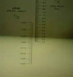 Reading of a urine specific gravity of ~1.024 via a handheld refractometer. SG measurement is taken by reading the boundary between the dark and light fields against the graduations on the left column.