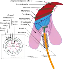 - At the other end, it develops a thickened mid-piece, where the mitochondria gather and the distal centriole begins to form an axoneme.