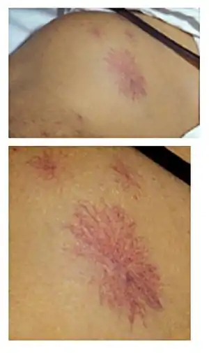 A spider angioma or spider naevus (plural spider naevi) is a type of telangiectasis[2] (swollen blood vessels) found slightly beneath the skin surface, often containing a central red spot and reddish extensions which radiate outwards like a spider's web. They are common and may be benign, presenting in around 10–15% of healthy adults and young children.[3] However, having more than three spider angiomas is likely to be abnormal and may be a sign of liver disease. It also suggests the probability of esophageal varices.[4]