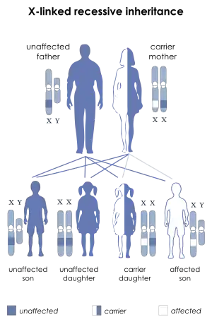 SBMA is a hereditary syndrome, inherited in an X-linked recessive manner.[7] The AR gene, located in the X chromosome, involves a section consisting of CAG repeats. The number of repeats varies among individuals. Healthy males carry up to 34 repeats. From 35 to around 46 repeats, penetrance (the possibility that the individual manifests the disease) gradually increases, approaching a maximum value (full penetrance).[10] Therefore, males bearing 35 to 46 CAG repeats are at intermediate but increasing risk for developing SBMA. Males bearing 47 or more repeats have nearly 100% risk of developing SBMA.[10] Other, still unidentified genetic factors may also play a role in disease manifestation and symptoms’ severity.