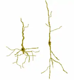 ![]() Cartoon of a normal pyramidal cell (left) compared to a von Economo cell (right) | |